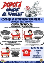 Сотрудники Госавтоинспекции призывают всех участников дорожного движения быть осторожными и внимательными. Недопустимо садиться за руль после употребления алкоголя. Человек, позволяющий себе такую вольность, потенциально опасен для окружающих. Под колесами нетрезвых водителей из года в год гибнут дети и взрослые. Каждая такая смерть - страшное горе для близких и родных погибшего человека. Необходимо постоянно помнить о той ответственности, которая ложится на вас, когда вы управляете автомобилем.