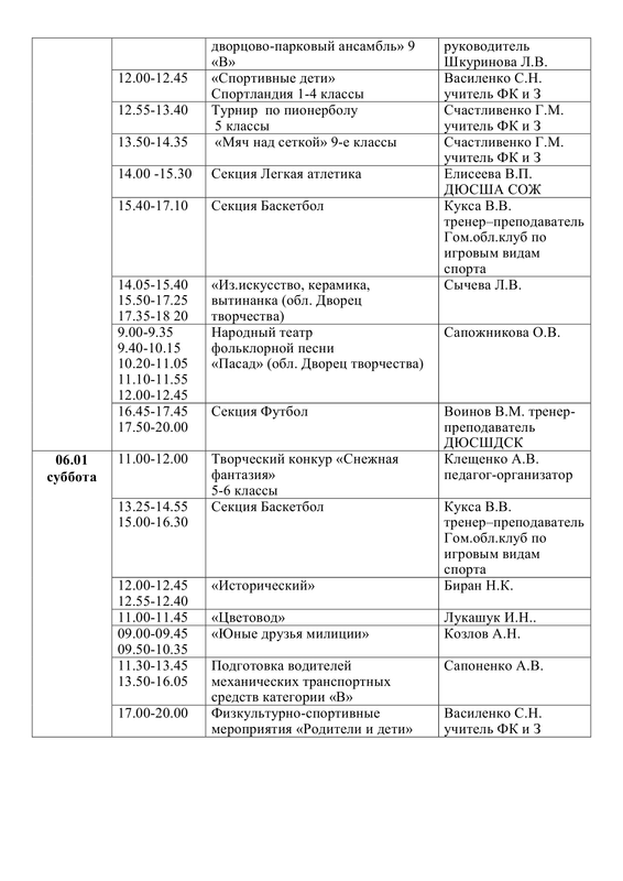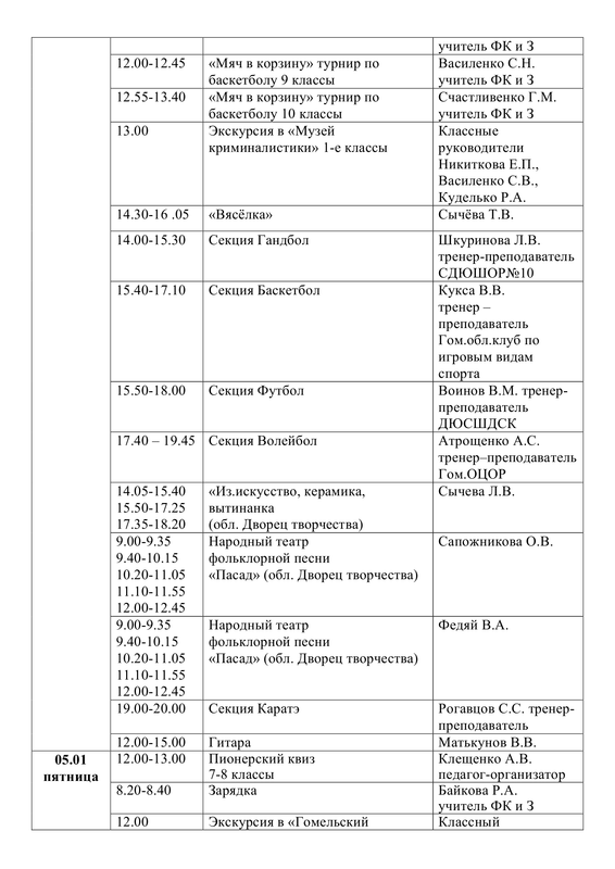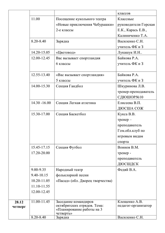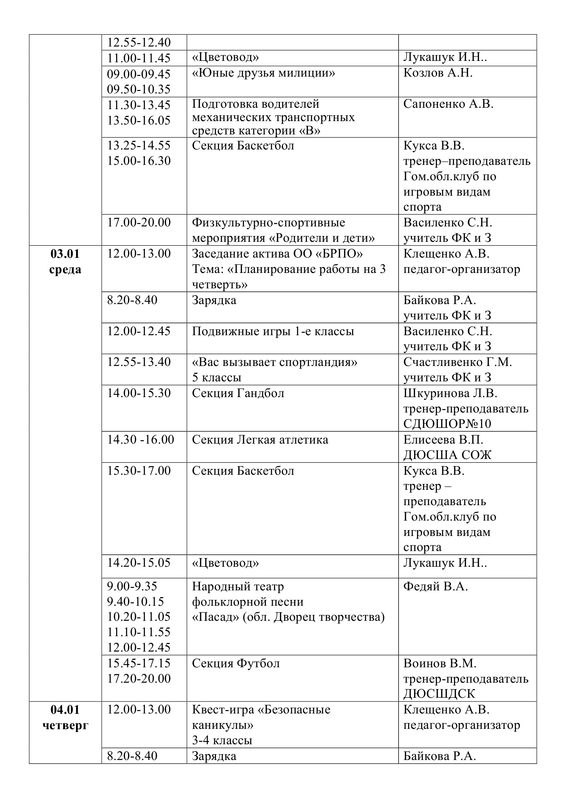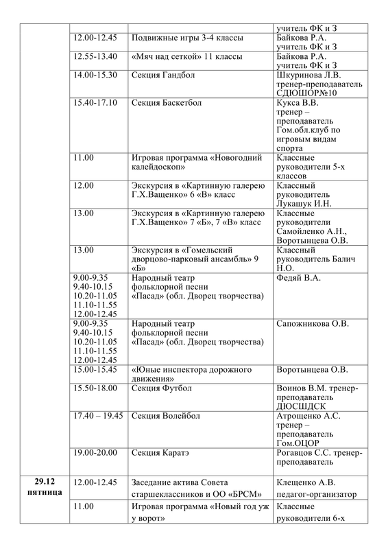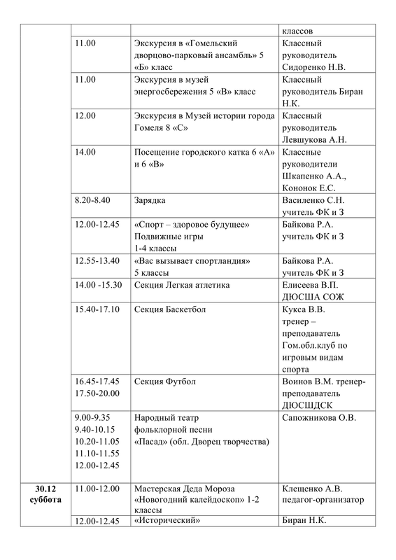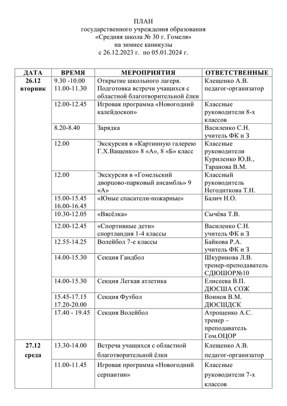 ПЛАН работы государственного учреждения образования «Средняя школа №30 г. Гомеля» на зимнее каникулы с 26.12.2023 г. по 05.01.2024 г.