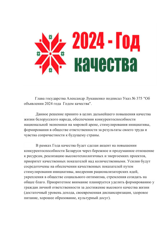 Глава государства Александр Лукашенко подписал Указ № 375 "Об объявлении 2024 года Годом качества".