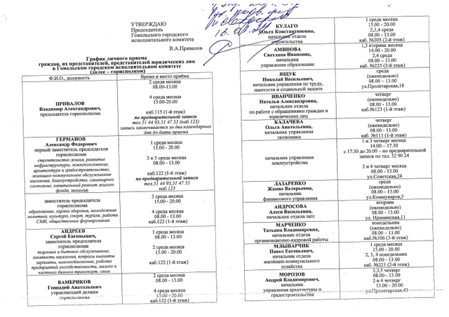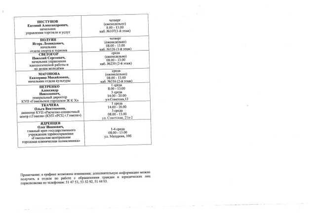 График личного приёма граждан, их представителей юридических лиц в администрации Железнодорожного района г. Гомеля