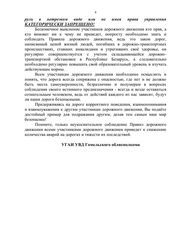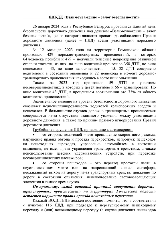 26 января 2024 года в Республике Беларусь проводится Единый день безопасности дорожного движения под девизом «Взаимоуважение – залог безопасности!», целью которого является пропаганда соблюдения Правил дорожного движения всеми участниками дорожного движения.