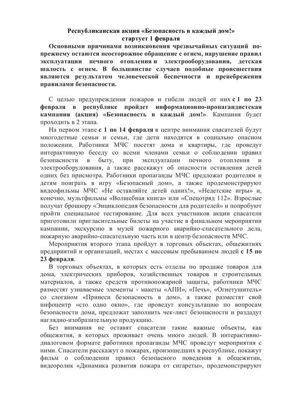 Республиканская акция «Безопасность в каждый дом!» стартует 1 февраля