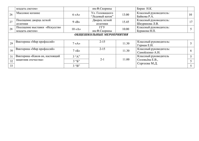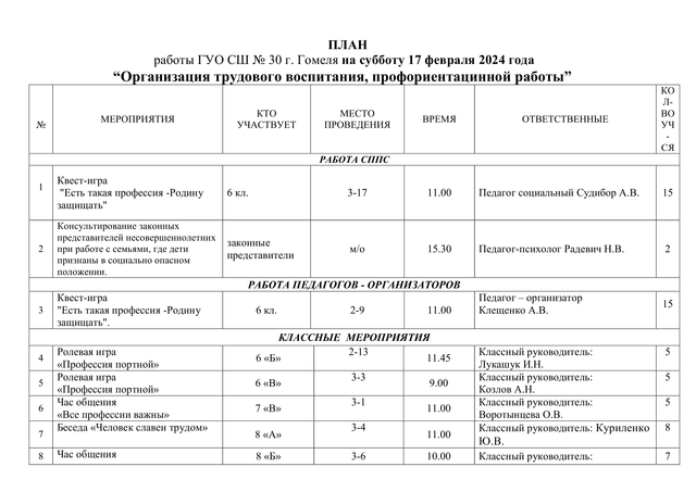 ПЛАН работы ГУО СШ № 30 г. Гомеля на субботу 17 февраля 2024 года “Организация трудового воспитания, профориентацинной работы”