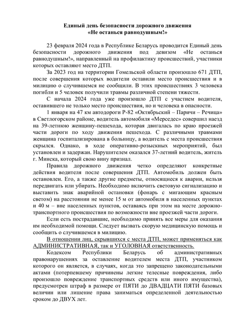 23 февраля 2024 года в Республике Беларусь проводится Единый день безопасности дорожного движения под девизом «Не останься равнодушным!», направленный на профилактику происшествий, участники которых оставляют место ДТП.