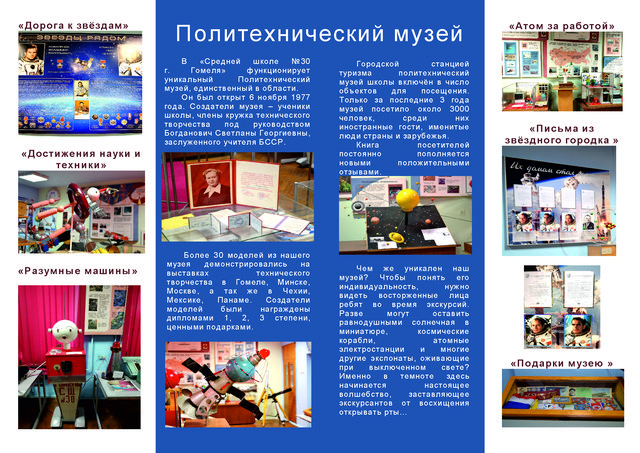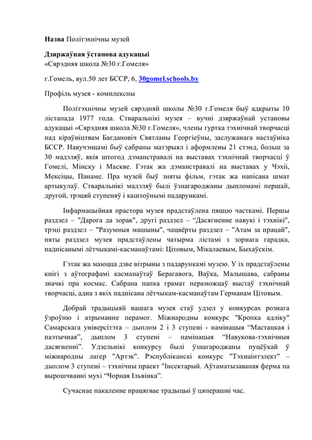 Політэхнічны музей сярэдняй школы №30 г.Гомеля быў адкрыты 10 лістапада 1977 года. Стваральнікі музея – вучні дзяржаўнай установы адукацыі «Сярэдняя школа №30 г.Гомеля», члены гуртка тэхнічнай творчасці пад кіраўніцтвам Багдановіч Святланы Георгіеўны, заслужанага настаўніка БССР. Навучэнцамі быў сабраны матэрыял і аформлены 21 стэнд, больш за 30 мадэляў, якія штогод дэманстравалі на выставах тэхнічнай творчасці ў Гомелі, Мінску і Маскве. Гэтак жа дэманстравалі на выставах у Чэхіі, Мексіцы, Панаме. Пра музей быў зняты фільм, гэтак жа напісана шмат артыкулаў. Стваральнікі мадэляў былі ўзнагароджаны дыпломамі першай, другой, трэцяй ступеняў і каштоўнымі падарункамі.