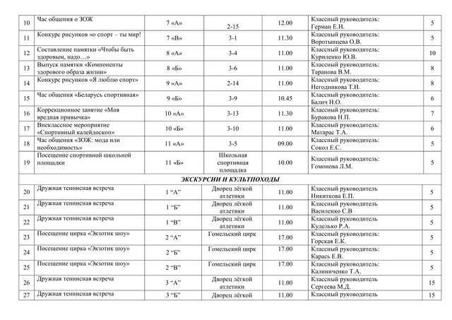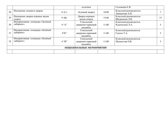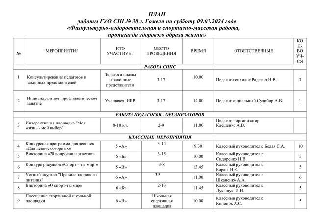 ПЛАН работы ГУО СШ № 30 г. Гомеля на субботу 09.03.2024 года «Физкультурно-оздоровительная и спортивно-массовая работа, пропаганда здорового образа жизни»