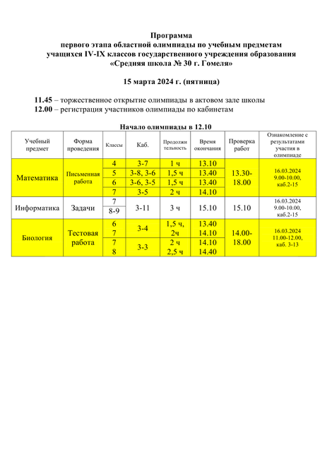 Программа первого этапа областной олимпиады по учебным предметам учащихся IV-IX классов ГУО «Средняя школа № 30 г. Гомеля» на 15.03.2024