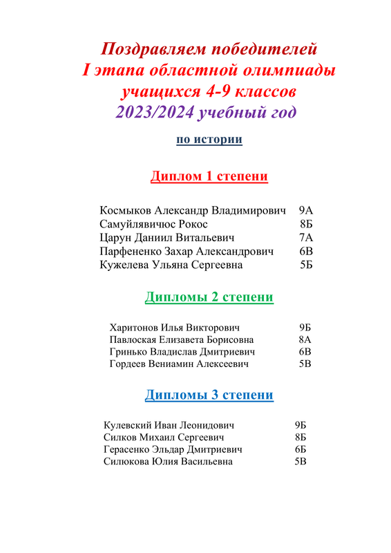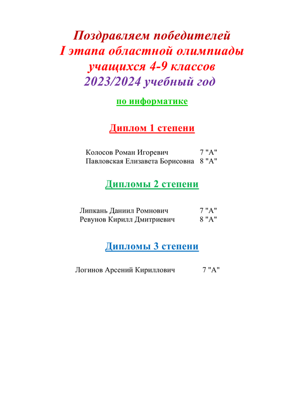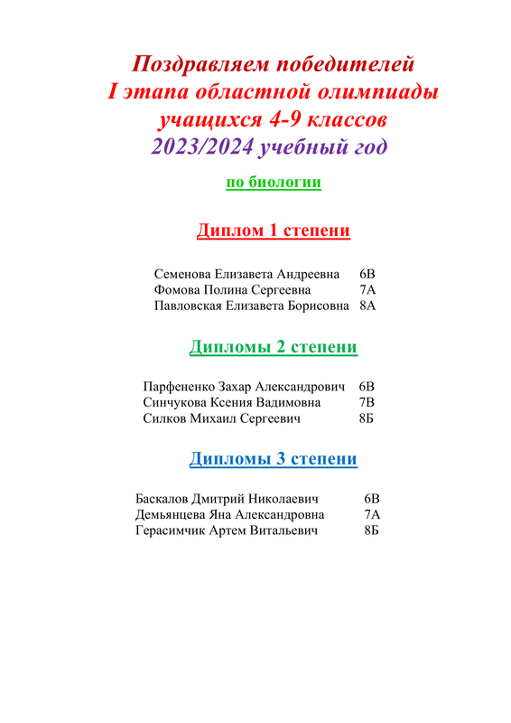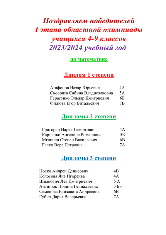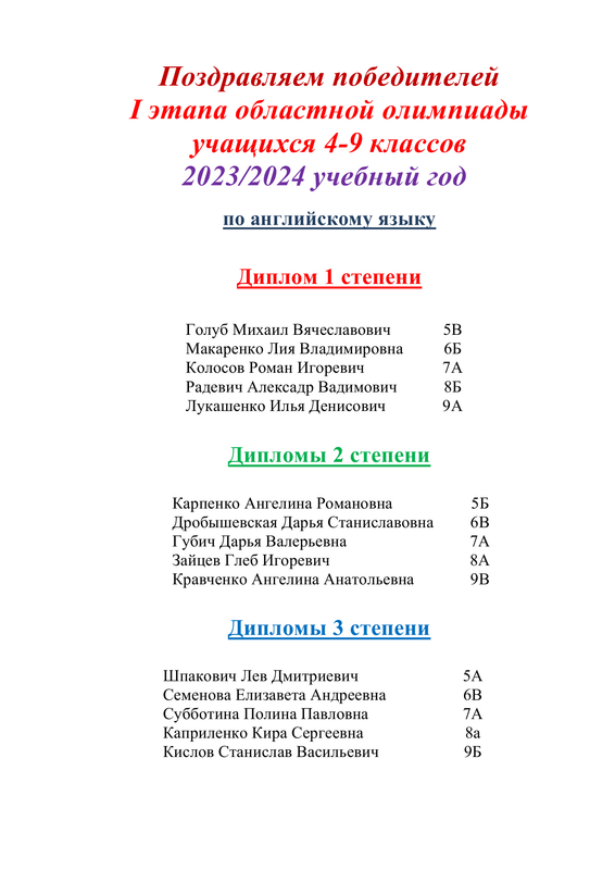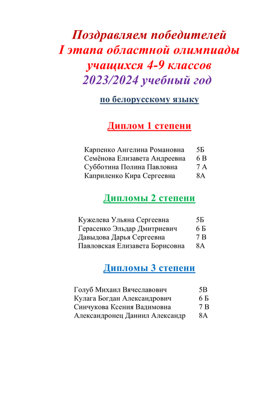 Поздравляем победителей I этапа областной олимпиады учащихся 4-9 классов 2023/2024 учебного года