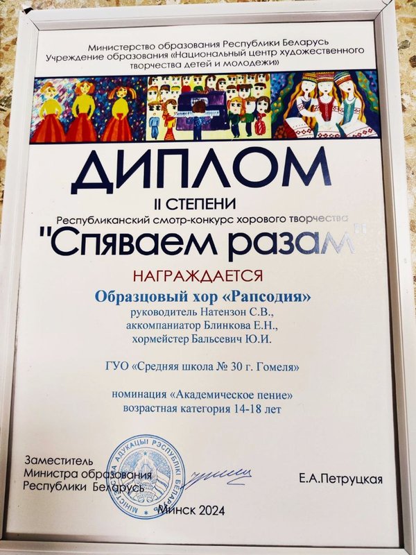 28 - 29 марта в Национальном центре художественного творчества детей и молодежи (г.Минск) состоялся заключительный этап республиканского конкурса хорового творчества "Спяваем разам". Девочки и ребята, участники Образцового хора "Рапсодия", продемонстрировали строгому жюри все свои певческие и артистические умения, всё,чему учились многие годы у своих педагогов, и в упорной борьбе заняли Второе место!!! в Старшей возрастной группе! Поздравляем ребят и педагогов Светлану Владимировну Натензон, Елену Николаевну Блинкову, Юлию Игоревну Бальсевич! БРАВО!