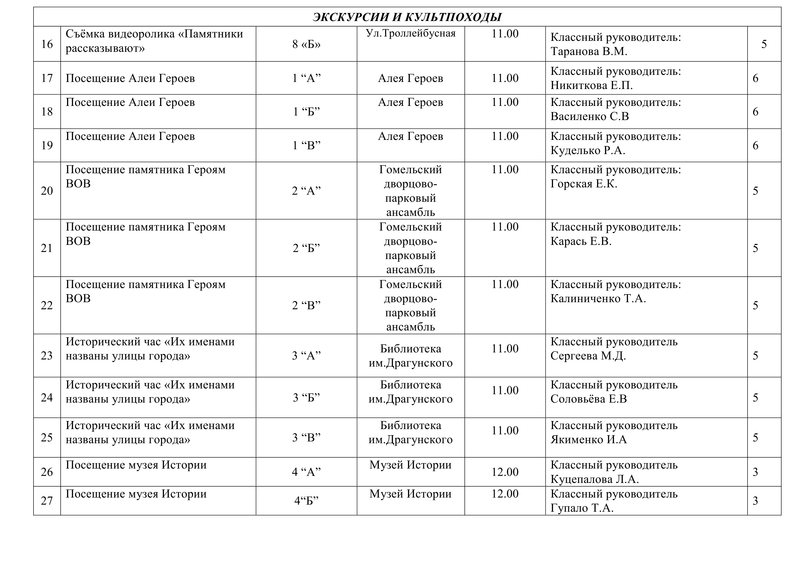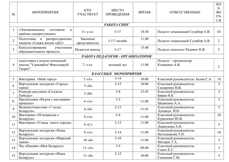ПЛАН работы ГУО СШ № 30 г. Гомеля на субботу 06.04.2024 года «Патриотическое воспитание учащихся в шестой школьный день»