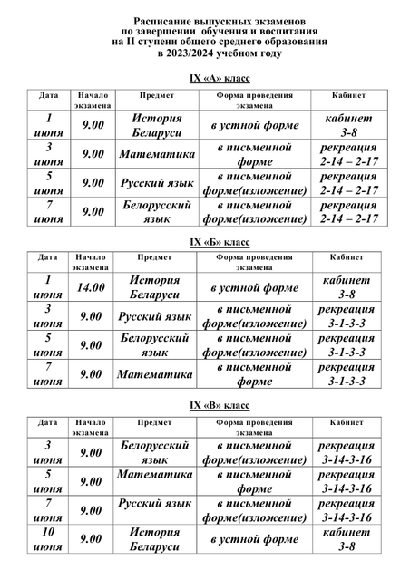 Расписание выпускных экзаменов по завершении обучения и воспитания на II ступени общего среднего образования в 2023/2024 учебном году