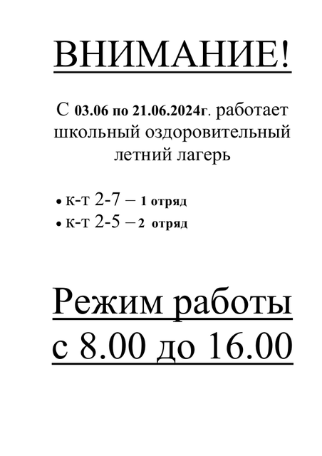 С 03.06.2024 г. начинает работу школьный оздоровительный летний лагерь
