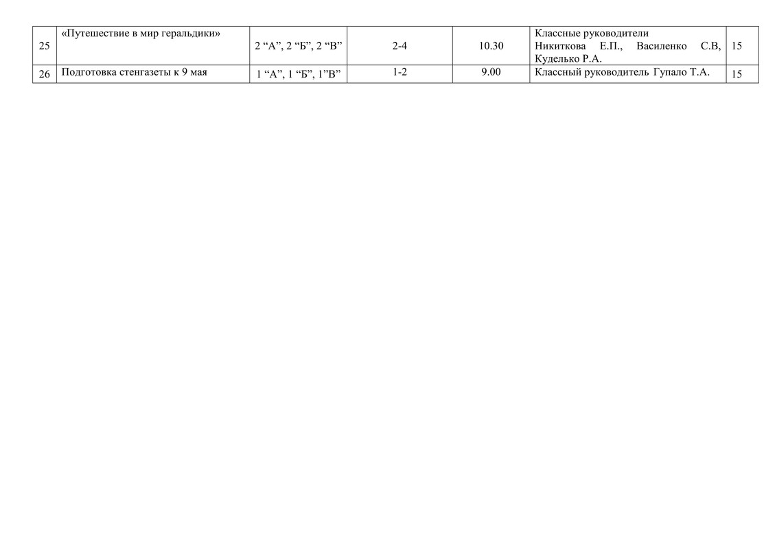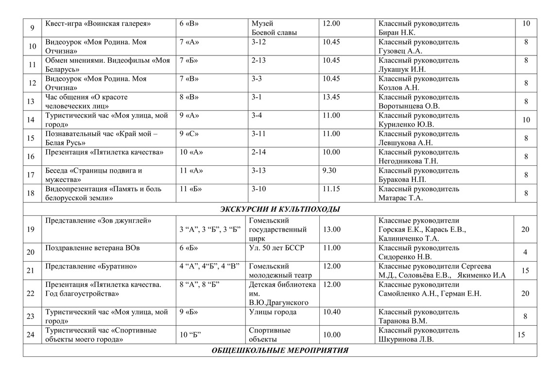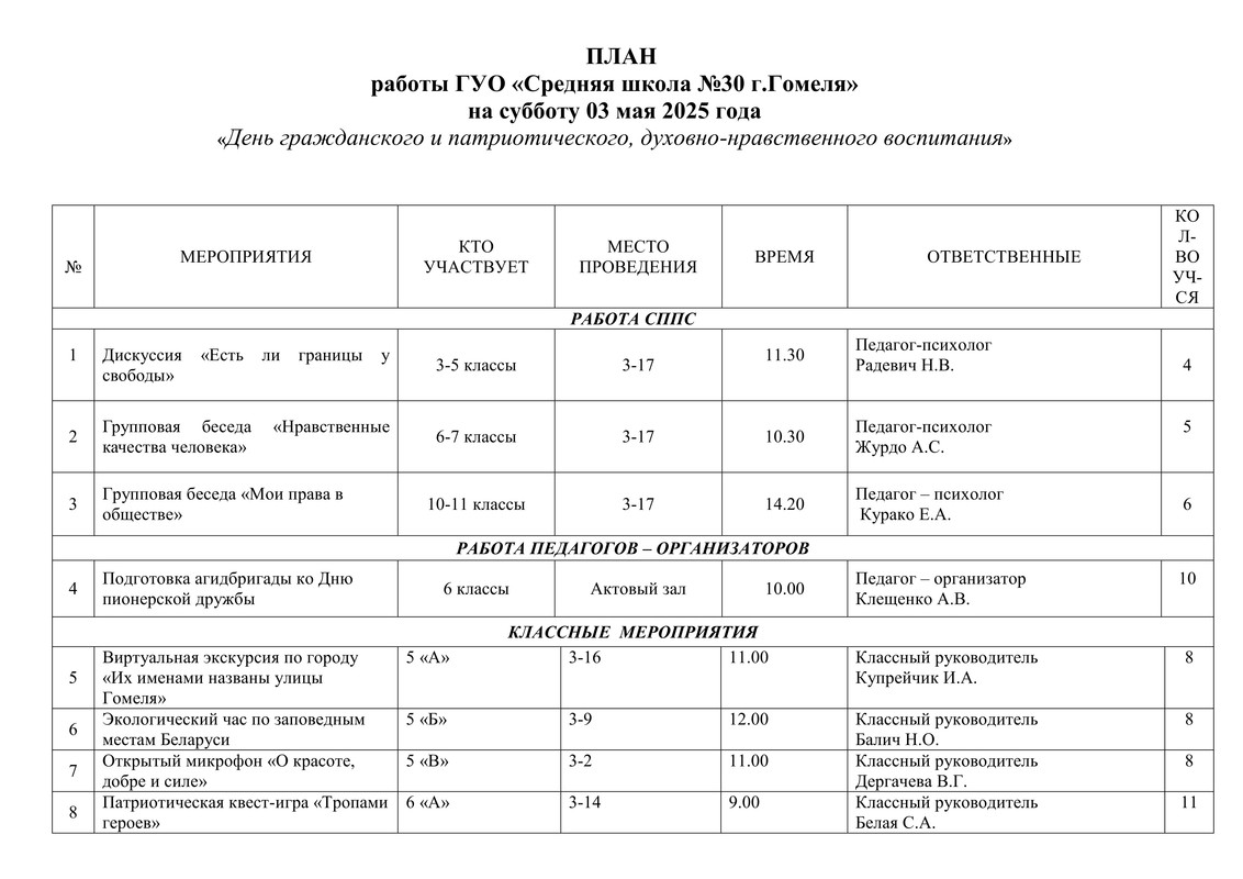 ПЛАН работы ГУО СШ № 30 г. Гомеля на субботу 3 мая 2025 года