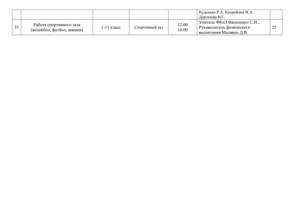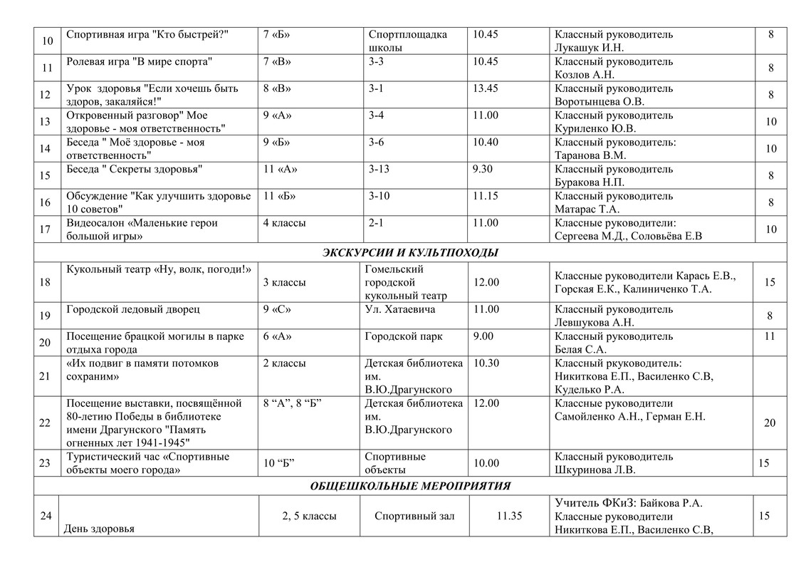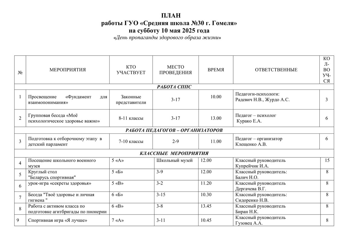 ПЛАН работы ГУО СШ № 30 г. Гомеля на субботу 10 мая 2025 года