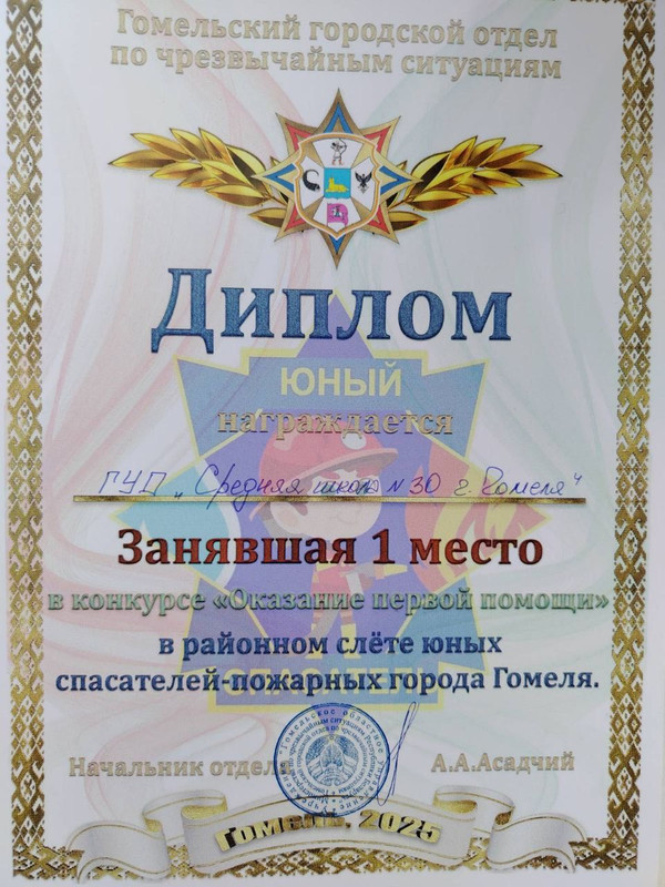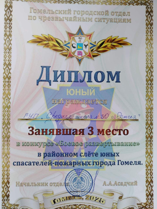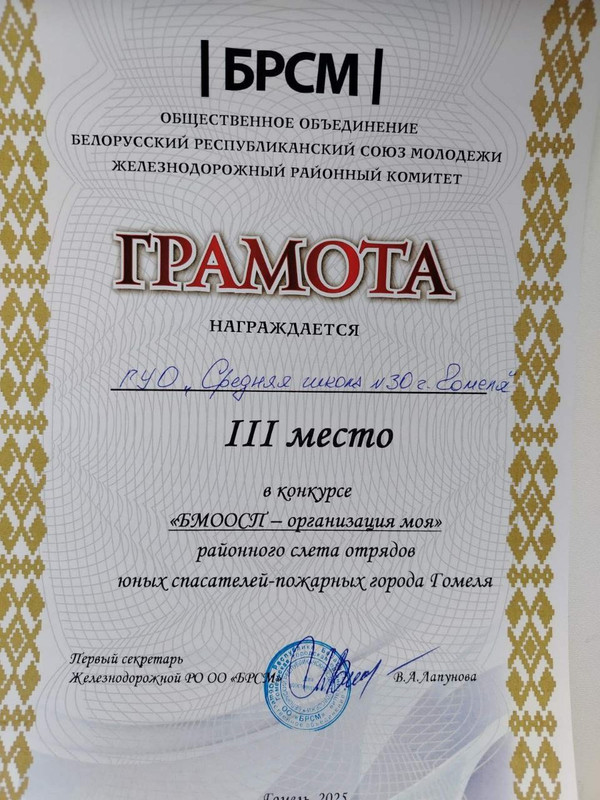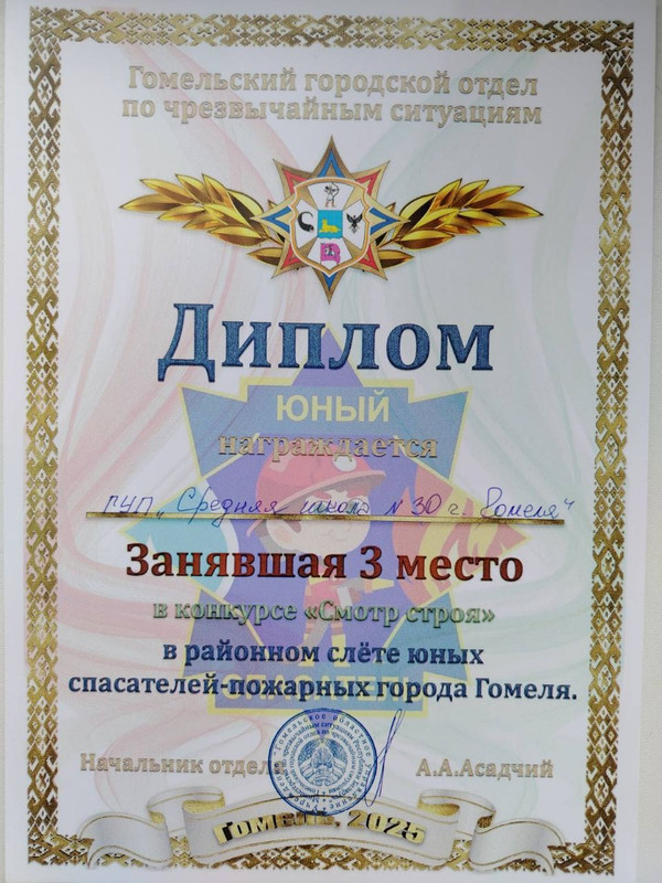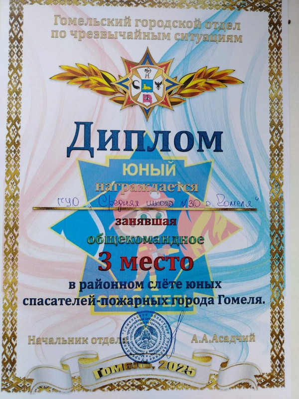 Члены объединения по интересам "Юные спасатели- пожарные" приняли участие в слете отрядов юных спасателей- пожарных Железнодорожного района, который проходил на базе СШ №9. Ребята показали свои знания и умения в области ОБЖ, оказания первой помощи, в творческом конкурсе, конкусах смотра строя и боевого развертывания. Результатом длительных соревнований стал диплом 3 степени, который дает возможность ребятам участвовать в городском этапе. Желаем нашей команде успехов!