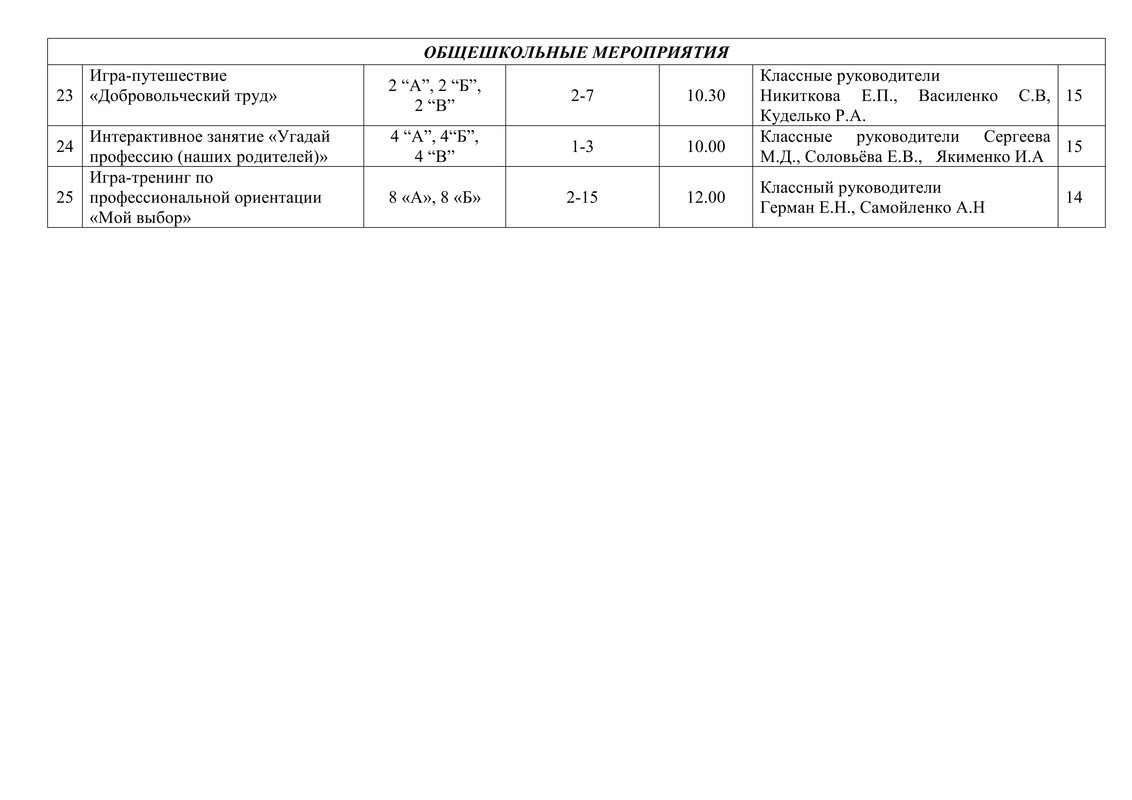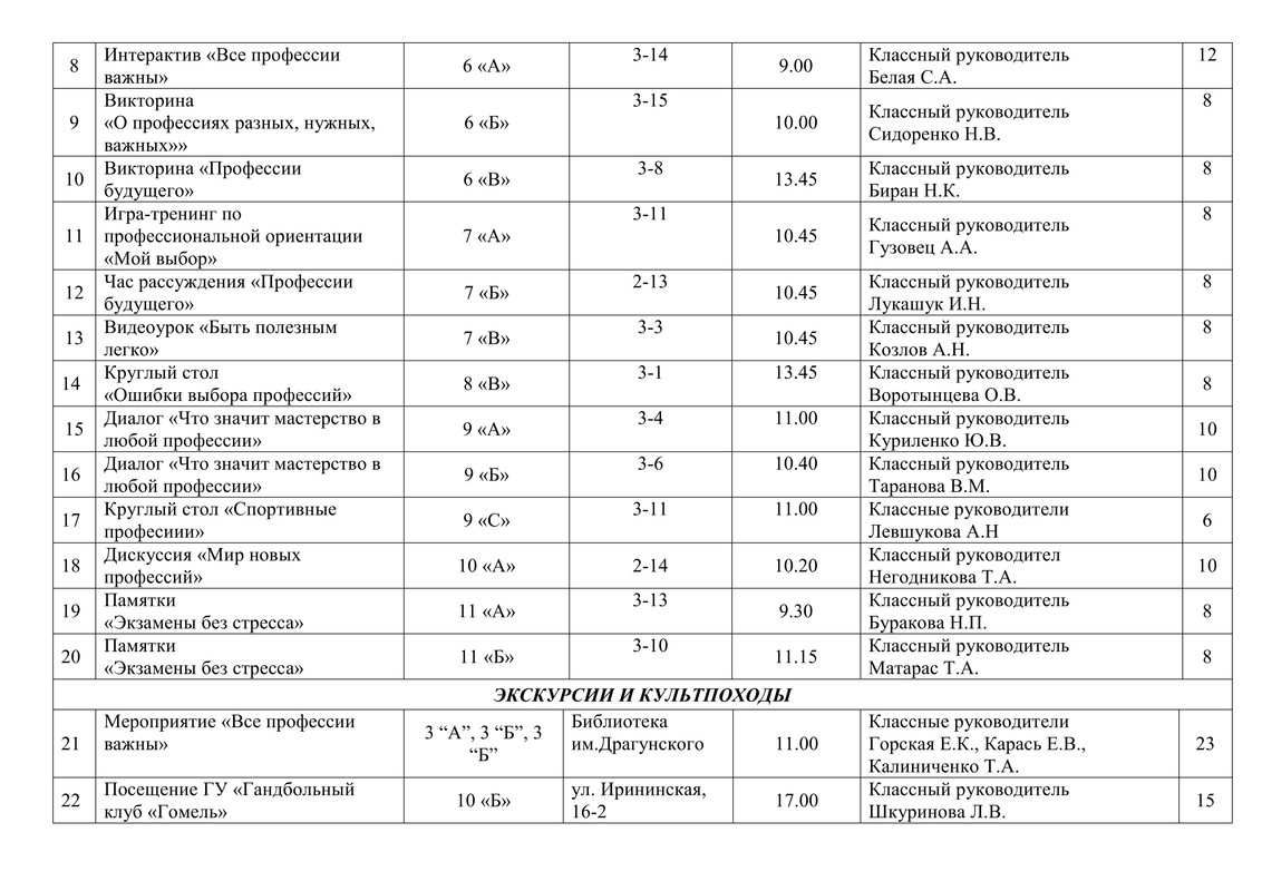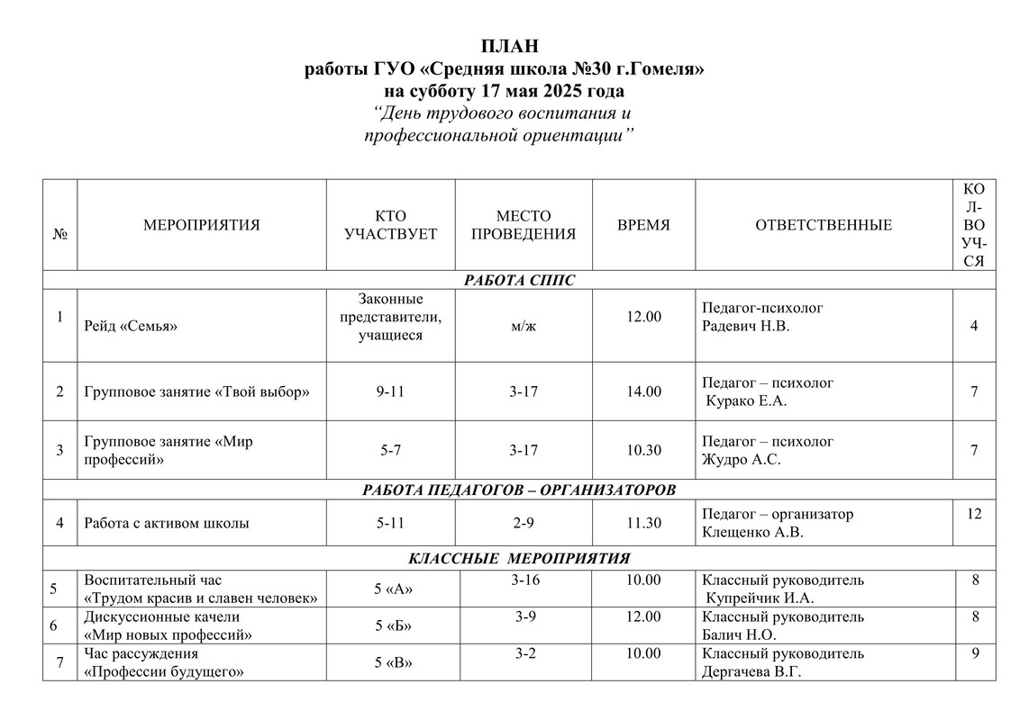 ПЛАН работы ГУО СШ № 30 г. Гомеля на субботу 17 мая 2025 года