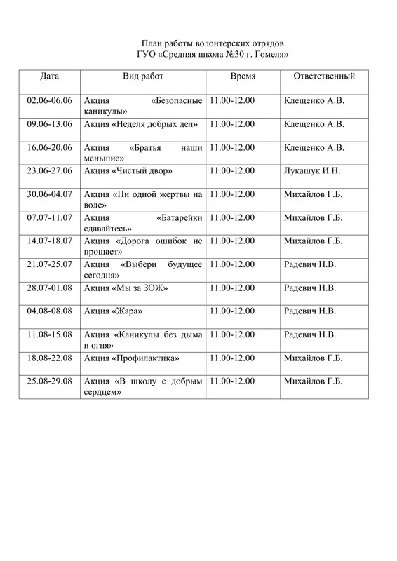 План работы волонтёрских отрядов ГУО "Средняя школа №30 г. Гомеля"