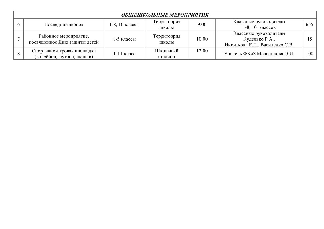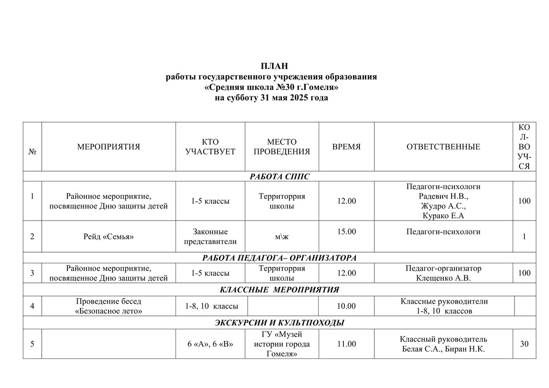 ПЛАН работы ГУО СШ № 30 г. Гомеля на субботу 31 мая 2025 года