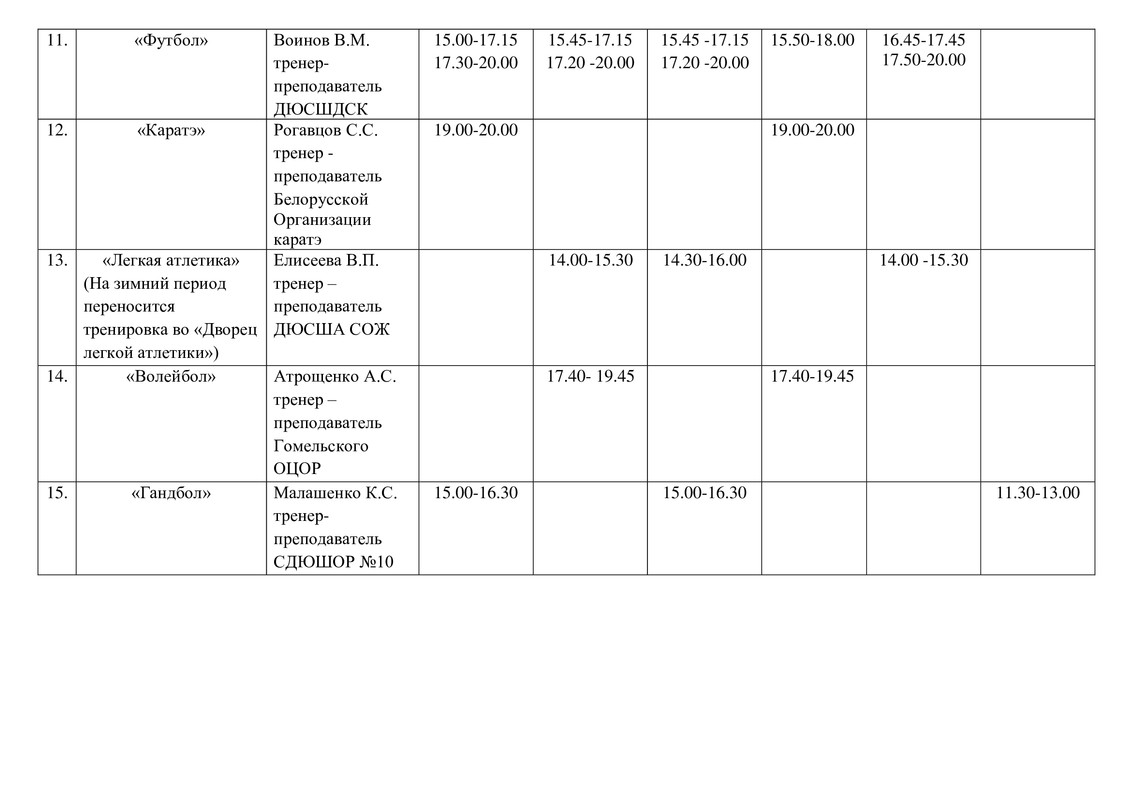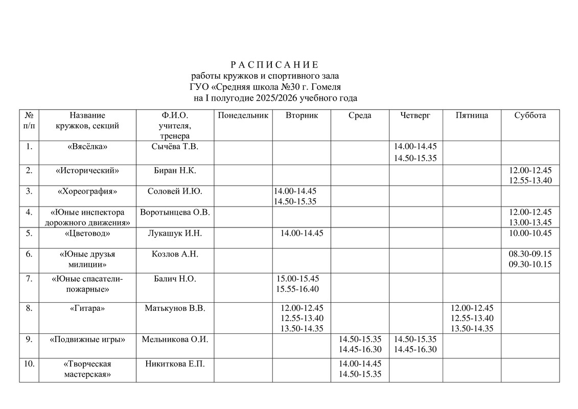 Р А С П И С А Н И Е работы кружков и спортивного зала ГУО «Средняя школа №30 г. Гомеля на I полугодие 2025/2026 учебного года