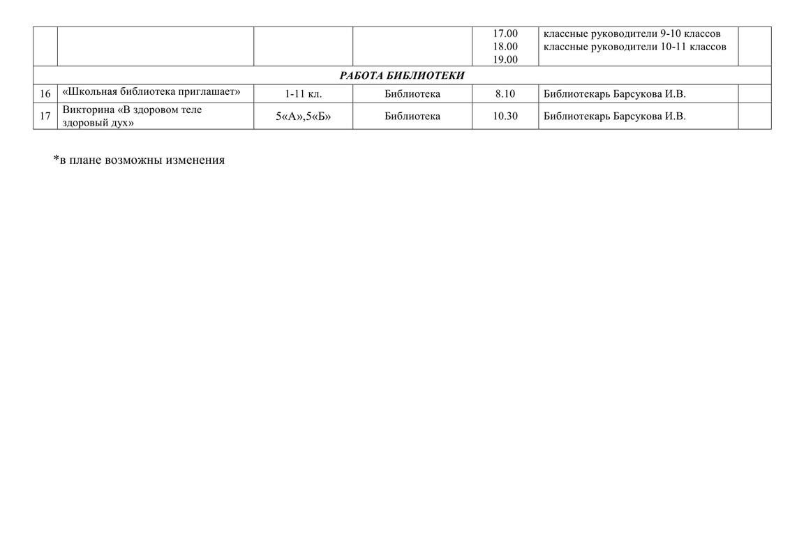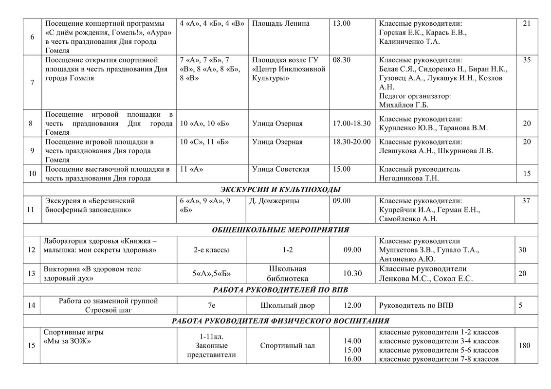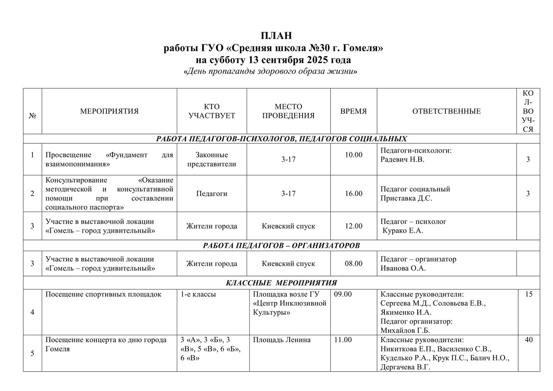 ПЛАН работы ГУО СШ № 30 г. Гомеля на субботу 13 сентября 2025 года