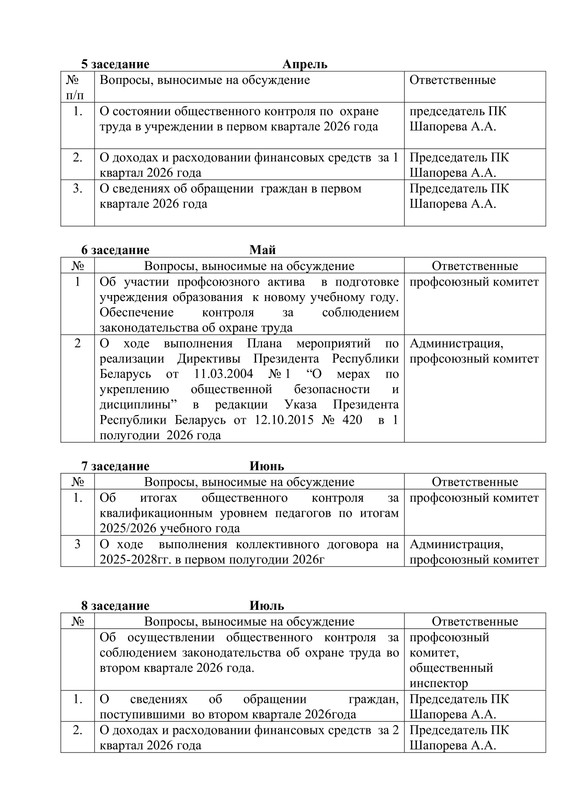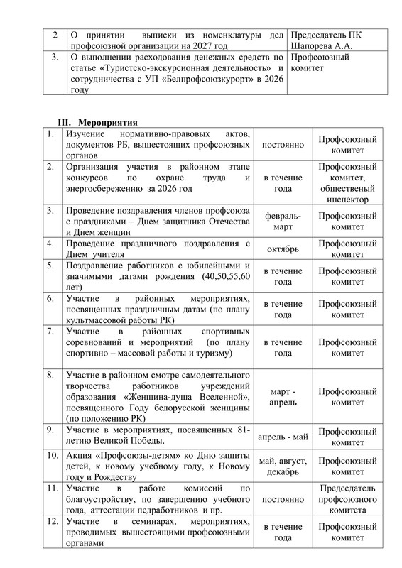 ПЛАН работы первичной профсоюзной организации государственного учреждения образования «Средняя школа №30 г. Гомеля» на 2026 год
